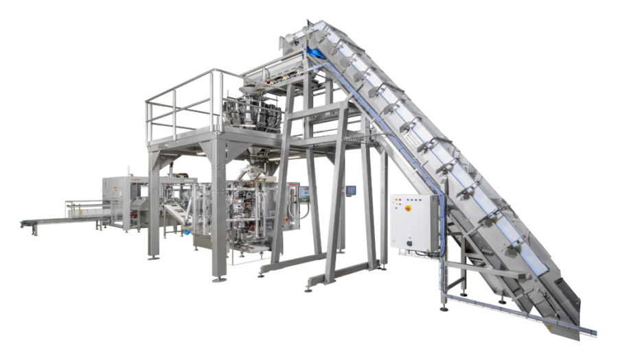 Beside the two vertical baggers and wraparound machine, the packaging part also included infeed, multihead-weighers, and quality check of the packed goods. This system gives the customer flexibility for the future, as the line is prepared to handle new material and products for a long time.